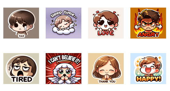 "感情のカーニバル"は、日常のあらゆる感情を表現するためのLINEスタンプです。8つの感情を、カラフルでユニークなキャラクターで表現しました。