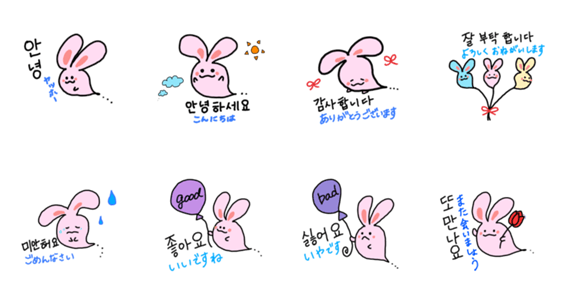 | スタンプ説明 | LINEスタンプメーカーでつくったスタンプです。うさおばけちゃんと一緒に楽しく韓国語を使いましょう! |
