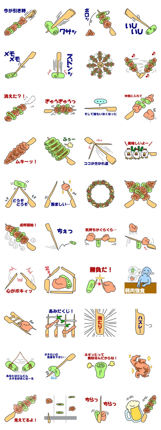 焼き鳥のねぎまスタンプです。葱と鶏肉と串がおもしろおかしく動きます。生だったり焼いてたりいろいろあります。