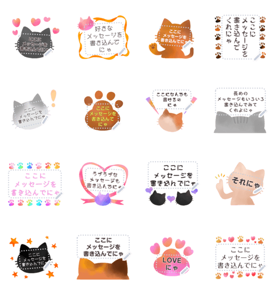 にゃんこ・猫部・ネコ・猫と暮らすあなたに♪ 黒猫・ハチワレ・三毛・グレー猫 ハートや肉球もたっぷり 自由に文字入力できる 猫の日 メッセージスタンプ ですにゃ♥ 現在この商品は一部のスマートフォン版LINE 10.3.0以上のトークルームでのみ使用できます。動作環境の最新情報はヘルプをご確認ください。