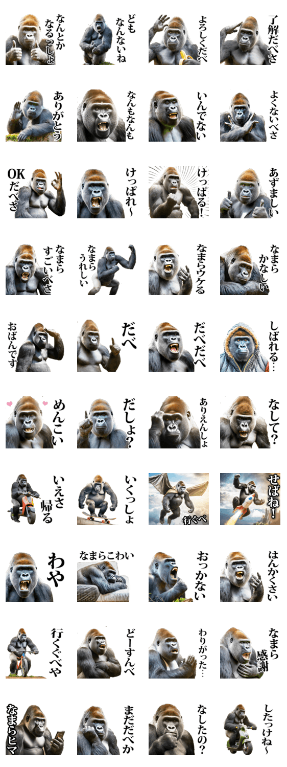 | スタンプ説明 | 北海道弁のゴリラのスタンプです。名古屋弁、広島弁、博多弁、関西弁、茨城弁のゴリラも発売中です!!!★全国47都道府県の方言ゴリラ随時発売予定!! |
