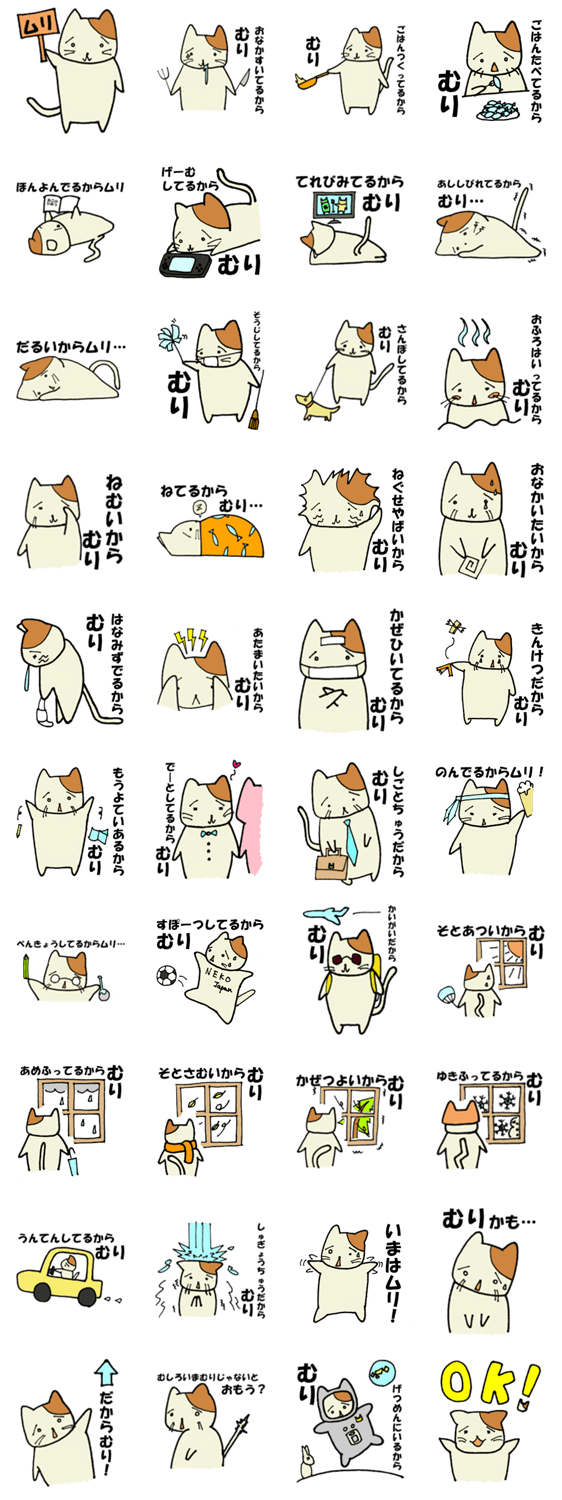 | スタンプ説明 | 相手の誘いや要望をやんわり断りたい…そんな時、むりねこスタンプを使えば、様々な言い訳で相手に断りをいれることができます。 |