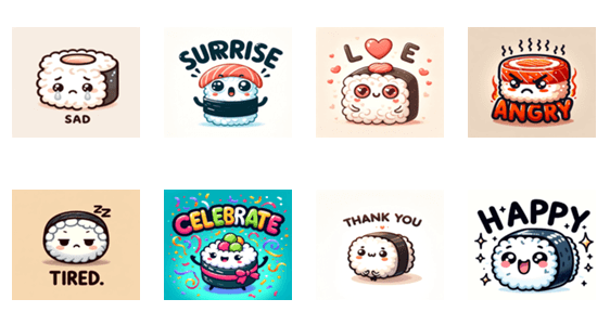 このスタンプセットでは、愛らしい寿司キャラクターが様々な感情を表現します!喜び、悲しみ、驚き、愛情、怒り、疲れ、祝い、このキュートな寿司と一緒に伝えましょう