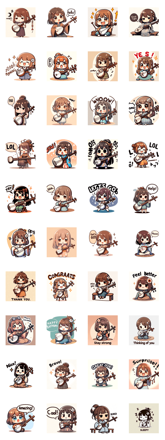 三味線を弾く女の子の可愛いスタンプ集。日常の感情やシーンを表すフレーズを含む、心温まるイラストで、コミュニケーションを彩ります。