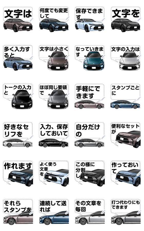 全スタンプ個別にセリフを自由入力して使えるスタンプですのでどんな言葉もスタンプにできます。 好きな車なのに使いたセリフでないという残念な事はもうありません。 現在この商品は一部のスマートフォン版LINE 10.3.0以上のトークルームでのみ使用できます。動作環境の最新情報はヘルプをご確認ください。