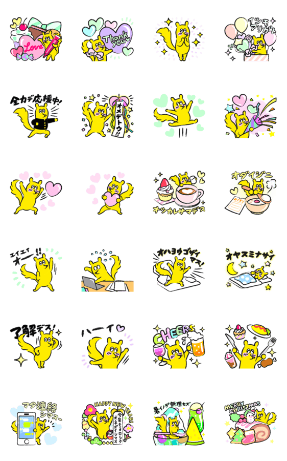 特別な日から日常まで、大切な方や頑張る人への気持ちがほっこり伝わるスタンプです。きいろいリスのチロルさんのアニメーションスタンプ第2弾。