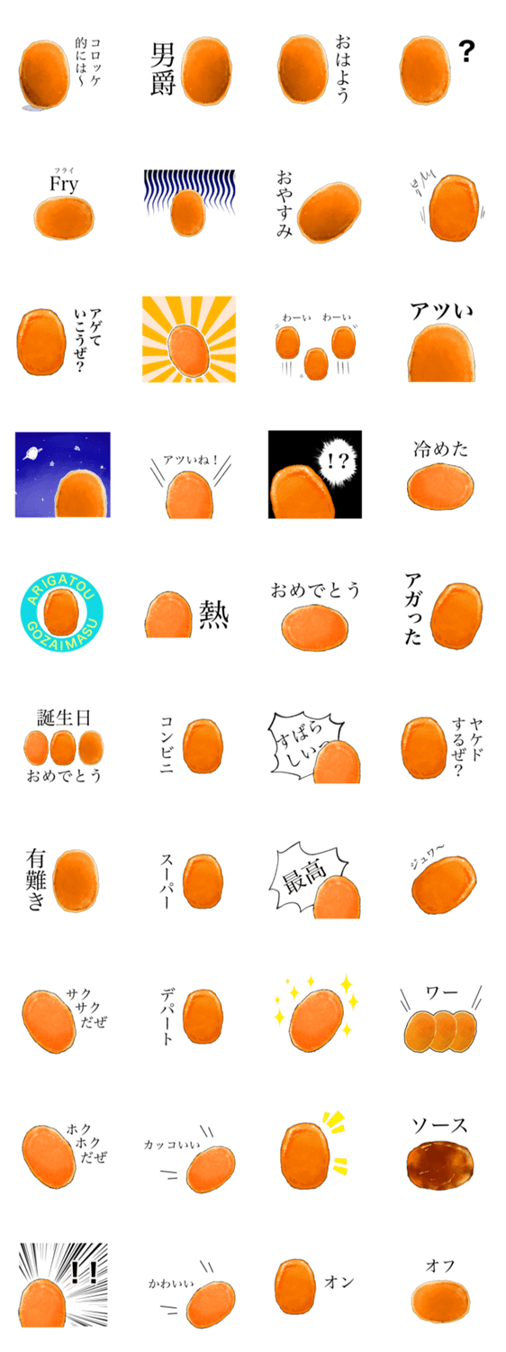 シュールなコロッケのスタンプです。アツい、アゲてなどダジャレっぽいワード多め。意外と使いやすいかも。