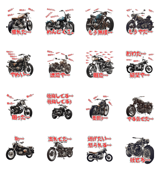 「ネガティブオートバイ」は、悲観的な態度を持つバイクのさまざまな表現を描いたlineスタンプです。その独特な魅力をこのコレクションで発見しましょう!