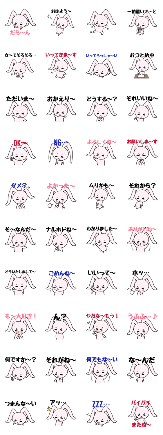 耳も心もたれ気味だけど、どこか愛らしいウサギ、「たれうさ」のスタンプです。色んなシーンで気軽に使ってね☆