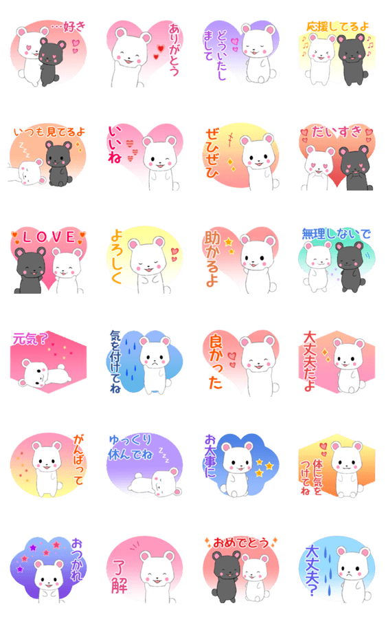 小さいくまたちのスタンプ第1弾。熊/クマ/白熊/白クマ/黒熊/黒クマ/カワイイ/可愛い/キュート/もふもふ/モフモフ/挨拶/日常会話/気持ち/感情