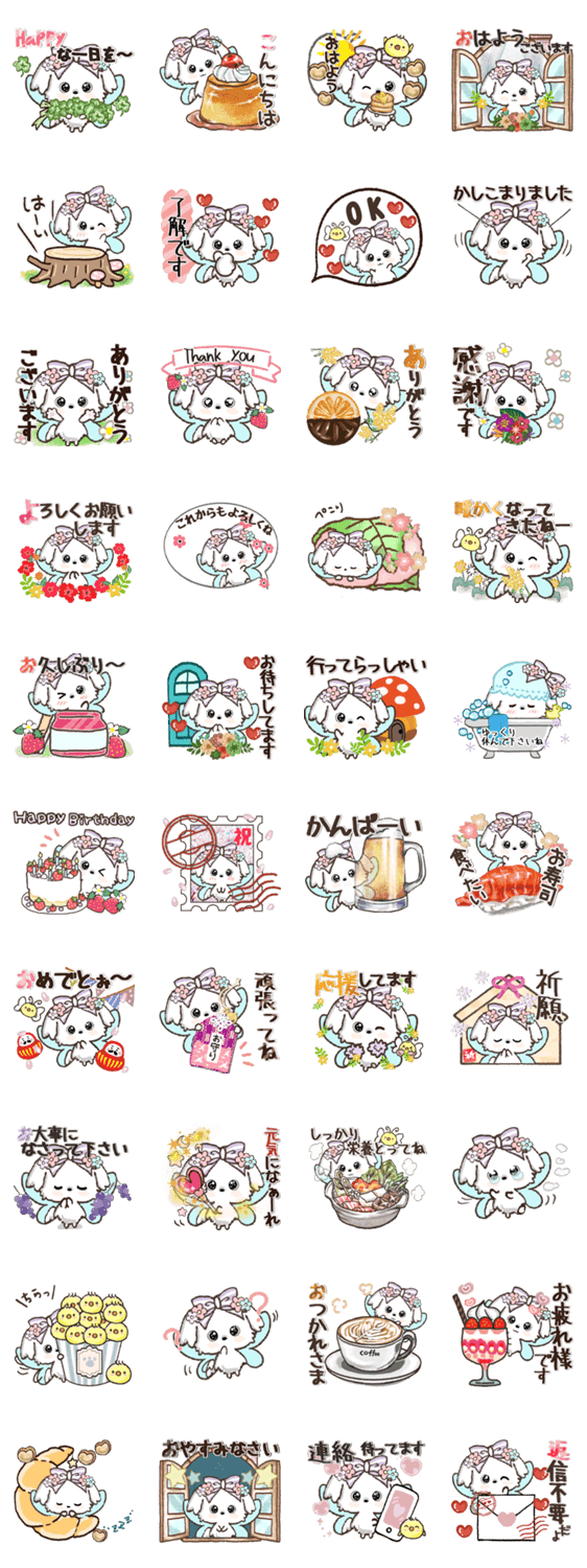 キュートな愛犬ワンコで優しい春色スタンプを揃えました♪毎日/マルチーズ/犬/挨拶/年中/ペット/愛犬/モフモフ/毎日/寿司/日常/気遣い/敬語/食べ物/ちょうちょ/春/Bnasuko