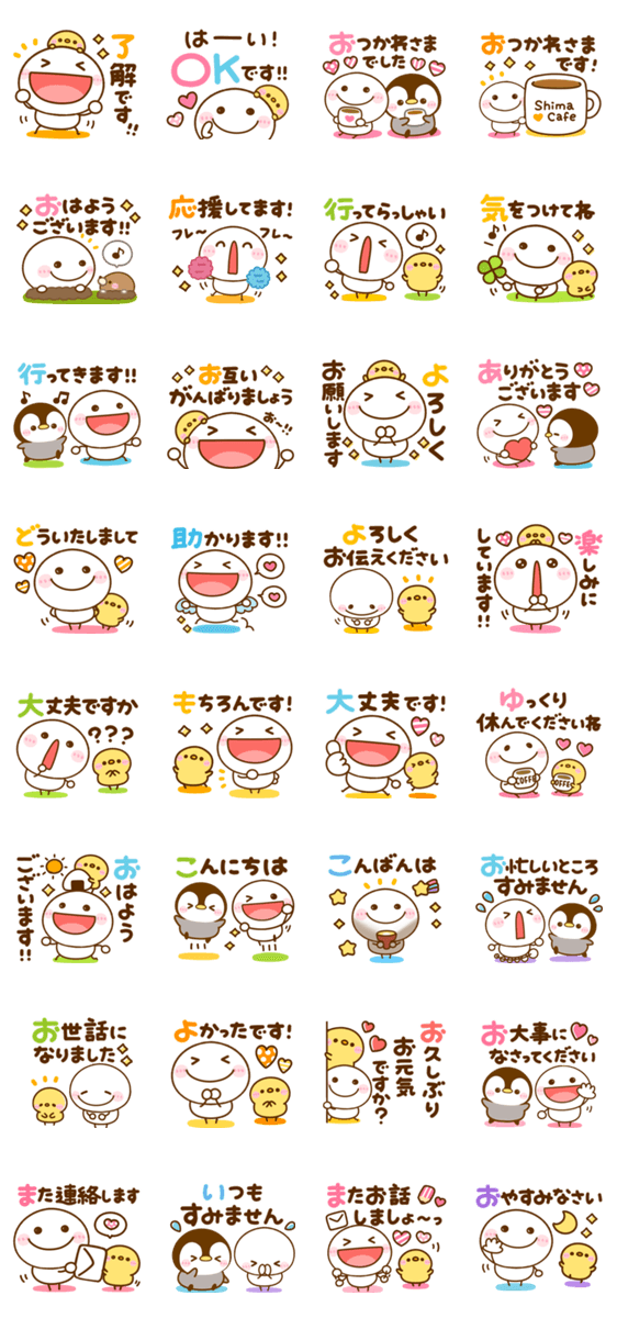 ぺんぺんとぴよこも時々登場♡ 棒人間のちびマロの役立つフレーズが詰まったカラフルなスタンプセットです♪