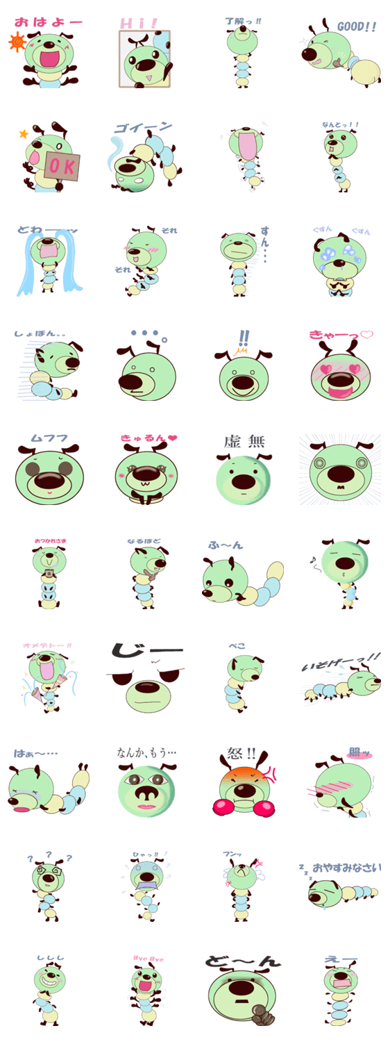 犬みたいな顔したイモムシくんのお返事しやすいスタンプです。スタンプだけで気持ちが伝わる表情で、普段使いしやすい犬顔いもむしくんをお楽しみください。