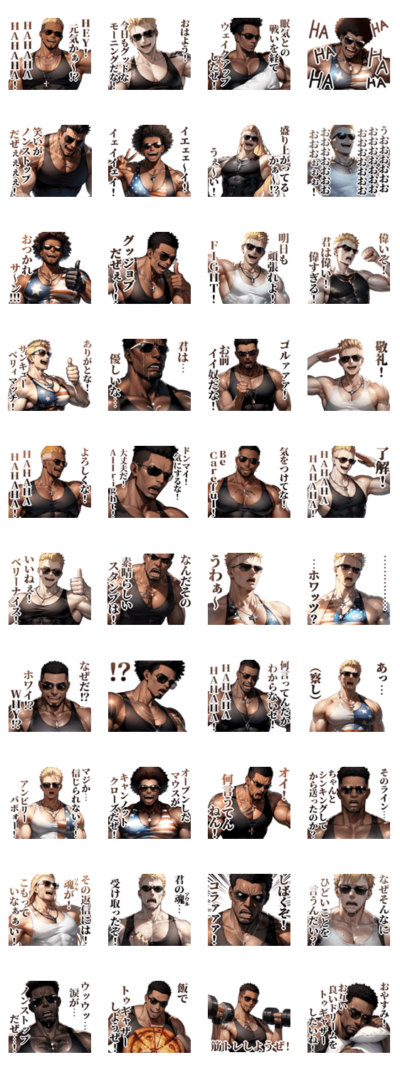なんかアメリカにいそうなマッチョたちのスタンプです。筋肉、マッスル、筋トレ、ボディビルダー、フィジーク、タンクトップ、サングラス、グラサン、タトゥー、外国人男性