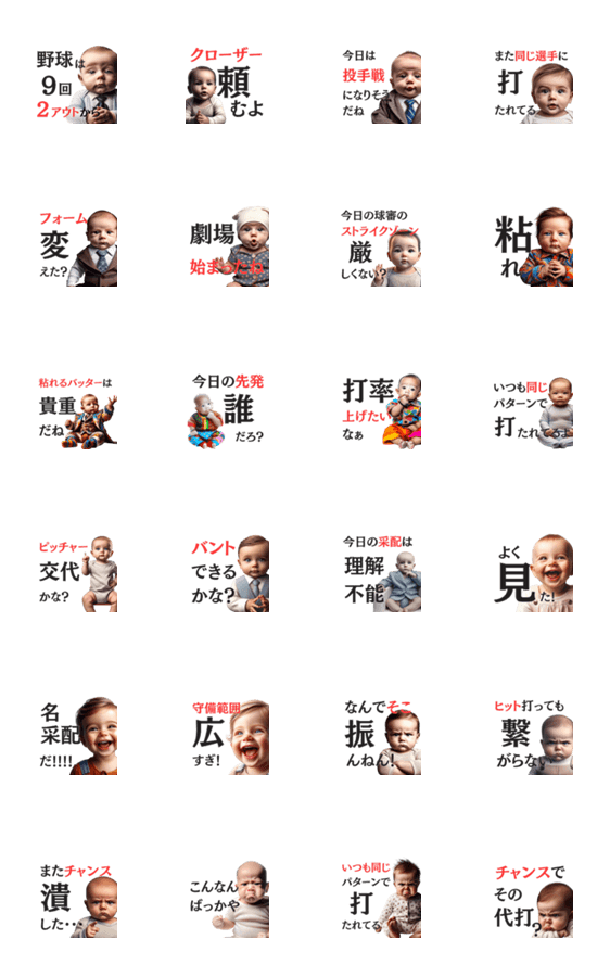 赤ちゃんが野球を語るスタンプです。 プロ野球/草野球/社会人野球/大学野球/少年野球/中学野球/高校野球/野球観戦/ソフトボール/女子野球/野球選手/赤ちゃん