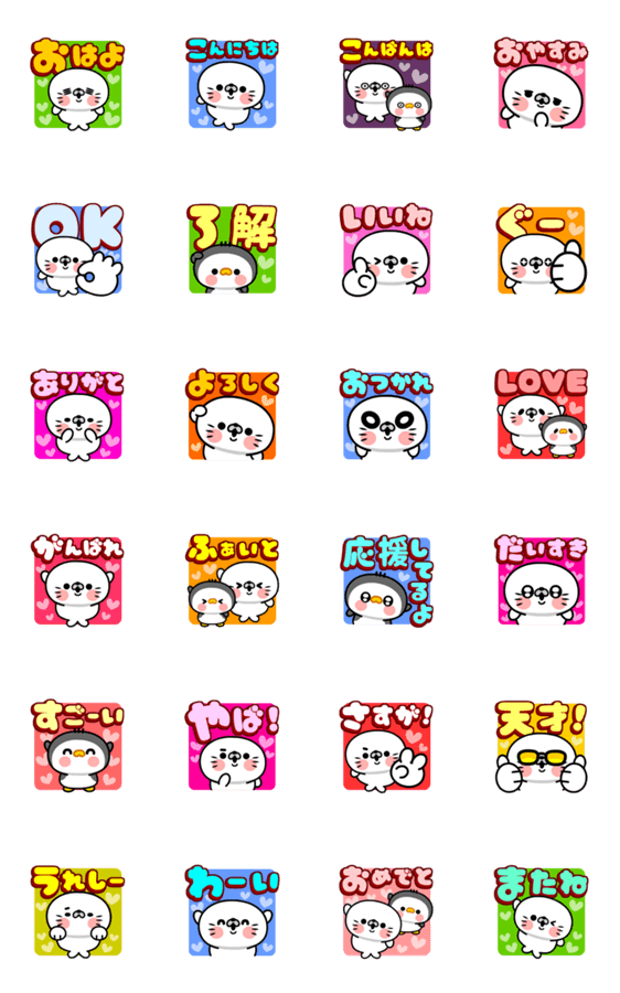 プニプニ可愛いアザラシのマシマシさんとペンギン君の楽しい挨拶スタンプ。でか文字!シンプル!使いやいよ!家族や友達と使ってねー。