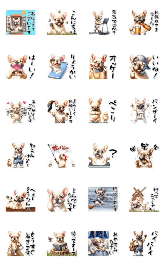 「おはようからおやすみまで、フレンチブルドッグの可愛さで一日を彩りませんか?フレブルさんの挨拶スタンプで、あなたのメッセージをもっと特別なものにしましょう!」