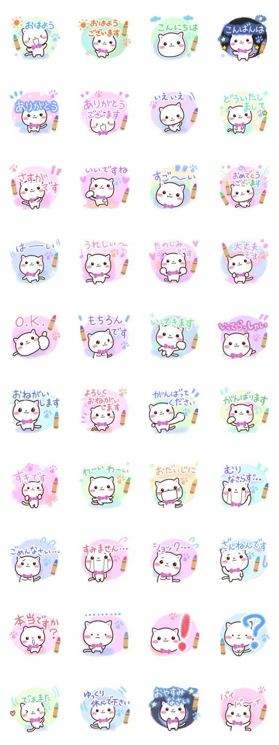 『シロネコすたんぷ』のクレヨンや色鉛筆で描いた文字のスタンプ。かわいい雰囲気の白猫。しろねこ好きな方にぜひ。【かたこ】毎日・可愛い・あいさつ・まるい・ちいさい