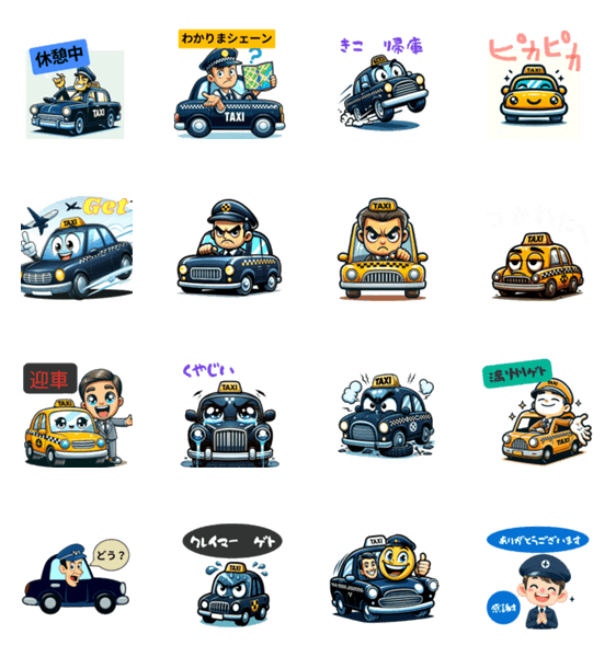 | スタンプ説明 | 業務の喜びも悩みも共有。タクシーの日常スタンプで日々のコミュニケーションを楽しく演出! |