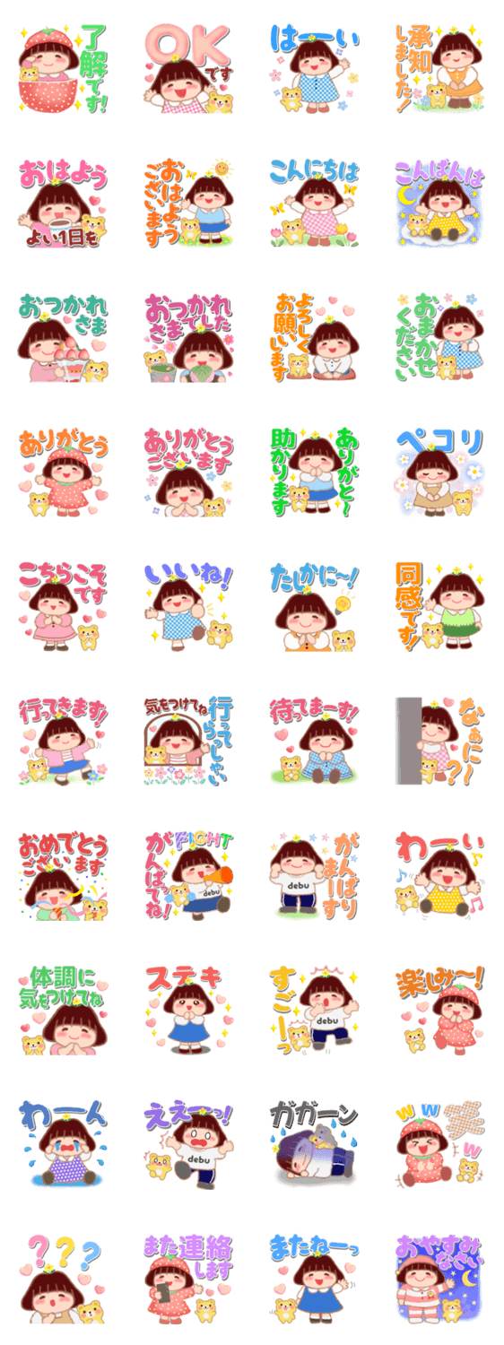 大きめの文字で見やすいちょっと太めの女の子「でぶりん」のスタンプです。