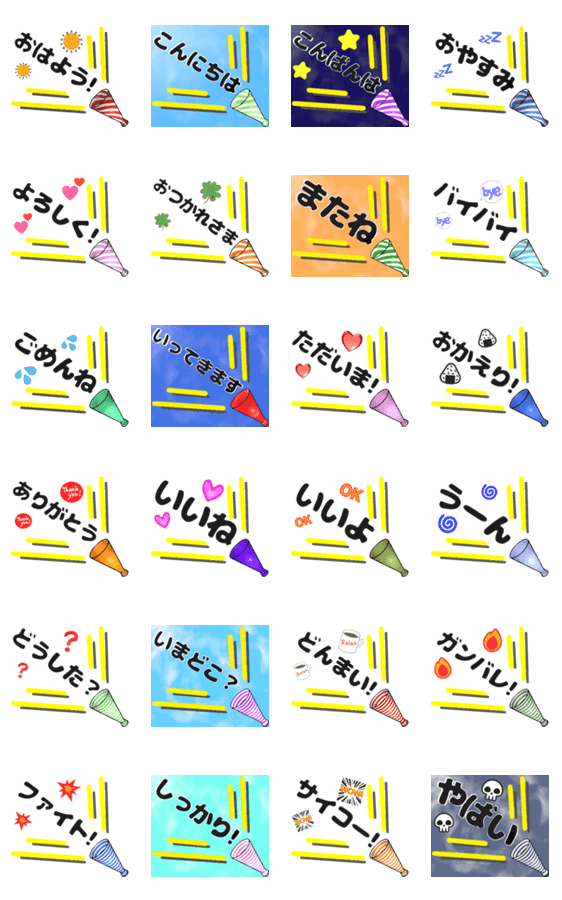 挨拶や応援とキラキラが流れる!背景が動くメガホンデカ文字やばいどんまいしっかりファイトいまどこ?ごめんまたねおつかれバイバイ大きい星ハートうーんOKカラフルポップ空