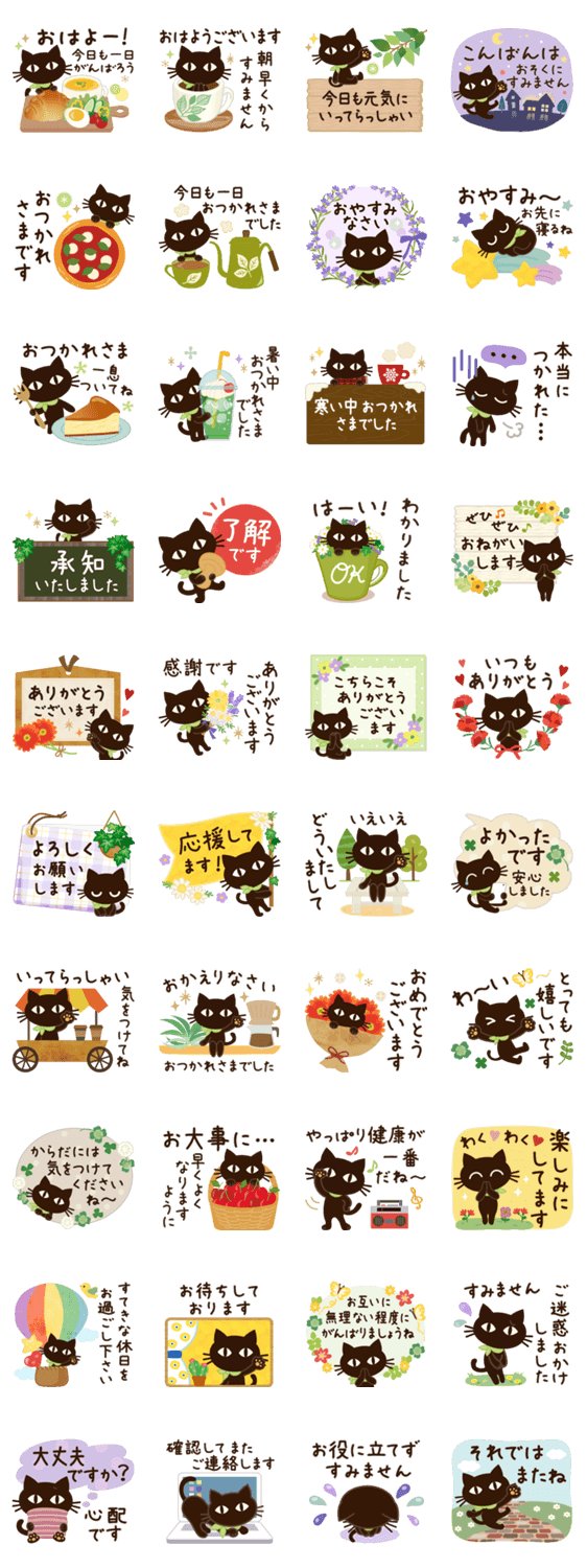 ず~っと使える♪かわいい黒ねこの日常気づかい挨拶スタンプ。春夏秋冬年中OK!新生活やお仕事・家族への気づかいなどに♪敬語多め/誕生日/母の日/紅おれんじの黒ねこ/猫
