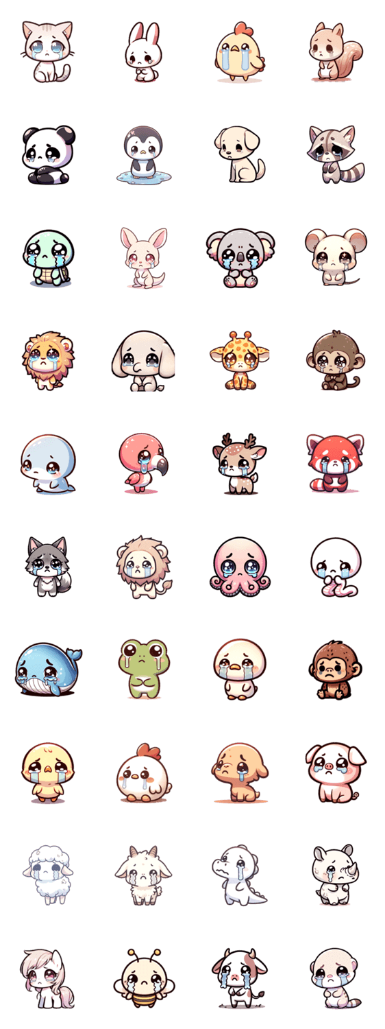 いろいろなどうぶつの「かなしい」スタンプ集です。 DALL-Eで作っています。