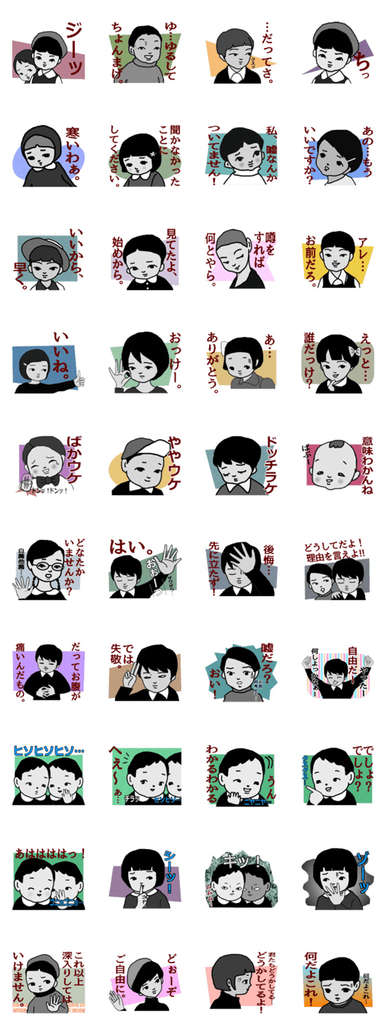 昭和レトロ風な子供たちの、色・雰囲気共に「グレイトーン」なスタンプ。ちょっとシニカル。シュールっちゃぁシュール。ある意味偏屈な彼らをどう使うかは、あなた次第!
