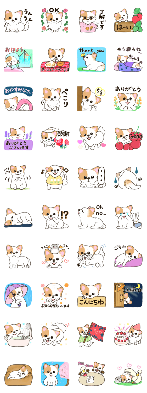可愛いチワワの春の彩りをイメージしたスタンプです。日常に使いやすいセットになっています♪毎日/日常/基本/春/カラフル/犬/白/花/あいさつ/シンプル