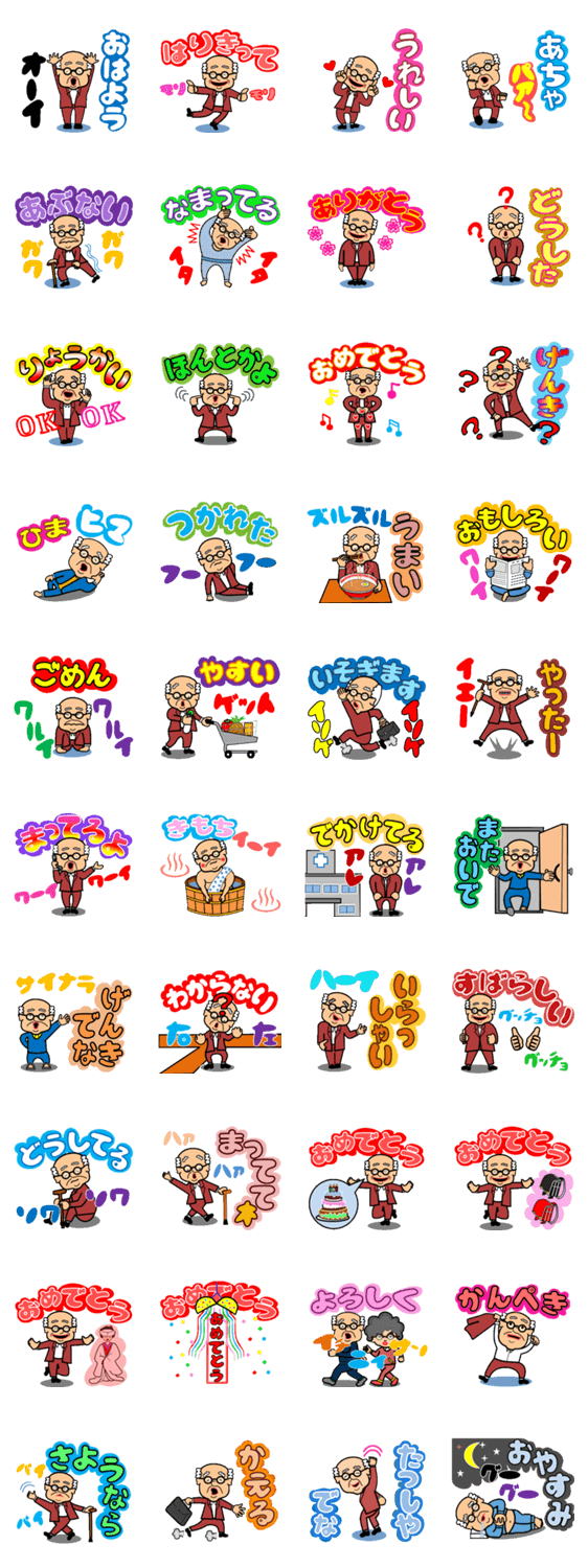 スタンプ説明 常に前向きに対応する、おじいさんの日常生活。