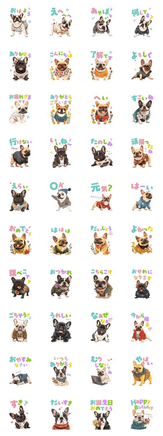 使いやすさ抜群のフレンチブルドッグのBIGスタンプ。見やすくてやさしい♡毎日使える挨拶や気遣いの言葉、誕生日など40匹のかわいいフレブルに癒されるスタンプです♪ #犬 ※このスタンプはトークルームで大きく表示されるBIGスタンプです。