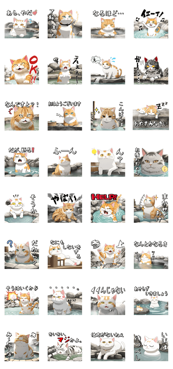 温泉に入った猫たちによる日常でも使えるスタンプです。