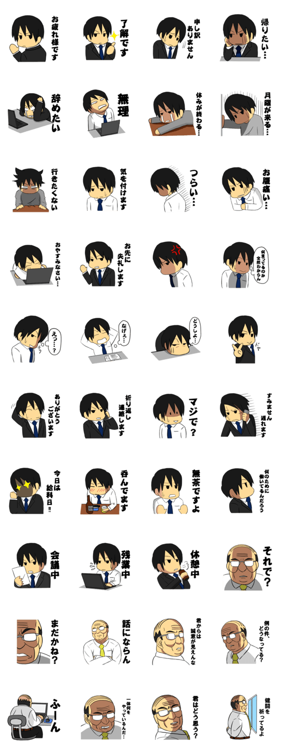 働きたくない時に呟けるスタンプの他、日常でも使えるものを収録。怖い上司スタンプもついてるよ!