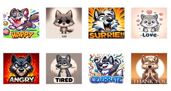 このLINEスタンプセットでは、表情豊かな狼のキャラクターが日常の様々な感情を表現しています。喜び、悲しみ、驚き、愛情、怒り、疲れ、お祝い