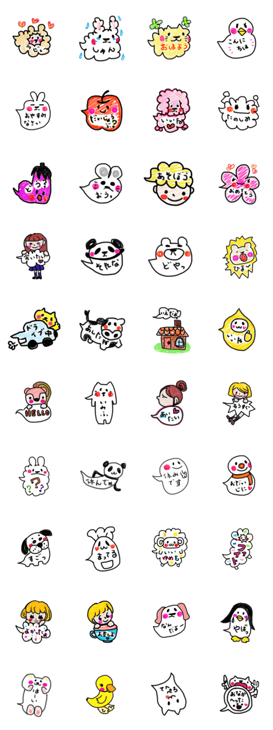 | スタンプ説明 | 色鉛筆で書いたシンプル、ゆるいアニマル。くま、犬、うさぎ、ねずみ、パンダ、牛、ひよこ、アルパカたまに野菜や女の子もいます。普段使いにどうぞ。 |