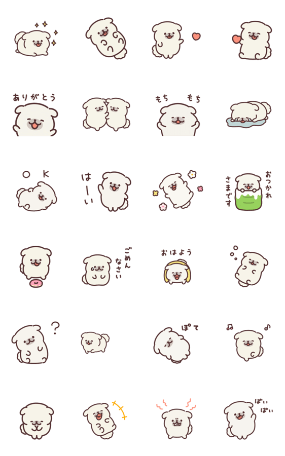 もちもちぽてぽてなペキニーズのスタンプ第3弾!ゆるく動く白ペキの毎日使えるアニメーションスタンプです。
