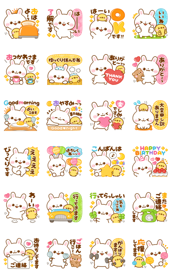 毎日の会話をカラフル楽しく華やかに彩る♪画面いっぱいに飛び出すうさぎのいほいっぷのポップアップスタンプです。