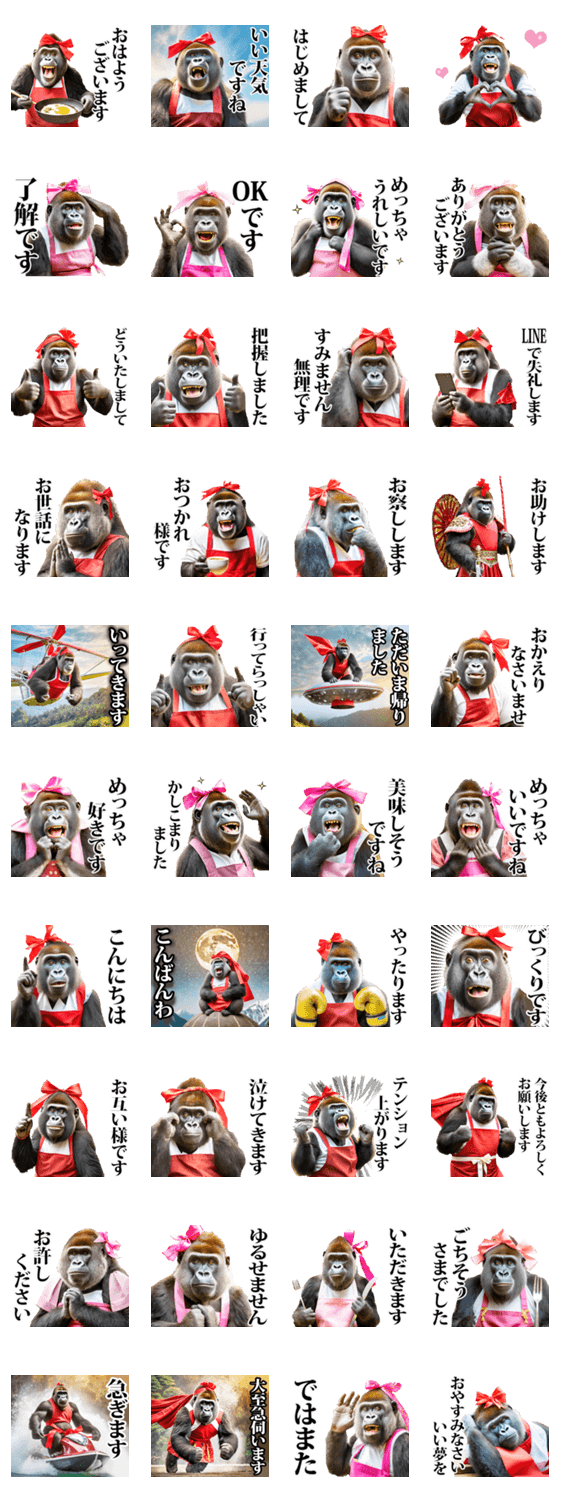 | スタンプ説明 | メスゴリラの敬語スタンプパート3です。毎日使えるあいさつスタンプを集めました。新年度にあると便利な敬語の挨拶スタンプ★超レアなピンクのメスゴリラもあります!! |