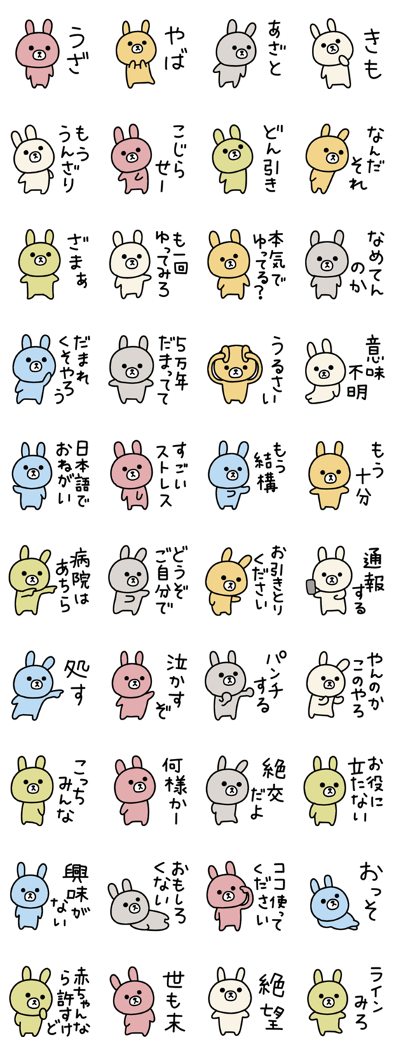 | スタンプ説明 | だるすぎて口が悪くなった雑なウサギのスタンプ。むかつく・面倒臭い・毒を吐きたい時、毒舌・辛口・ブラック・怒りの気分の時、実は結構本音だからなんだかんだ結構使える |