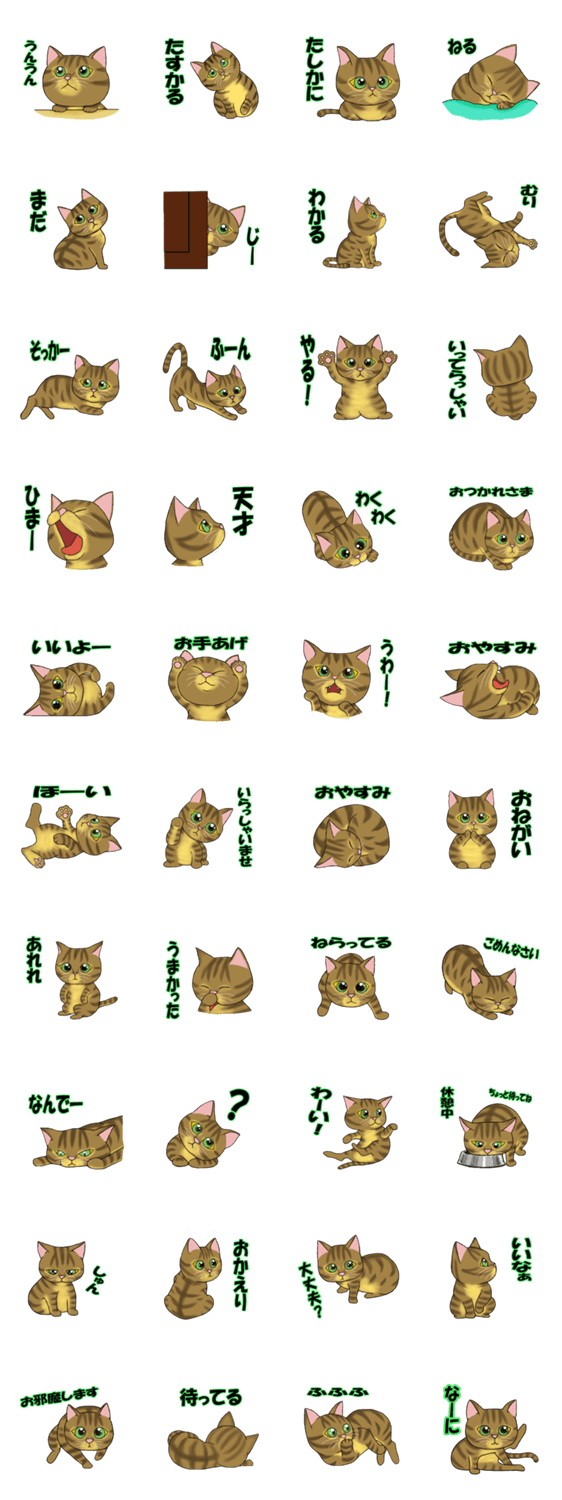 キジトラ猫は、とても可愛いです。これらのスタンプを使って、すばやく簡単に返信してください。