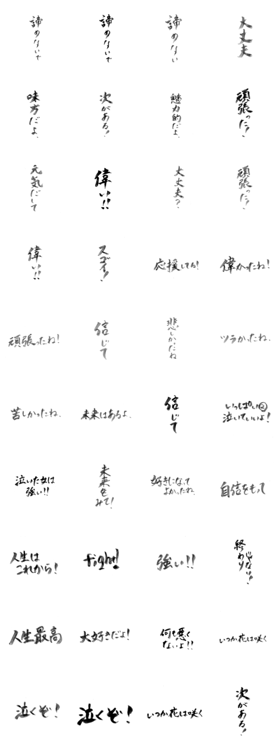 薄い筆で、悲しんでいる人、失恋などをした人を励ますスタンプ。 薄い独特の雰囲気や柔らかさと、濃い方もあった方がいいなと思った文字は両方あります。