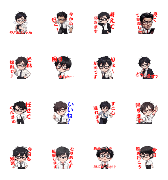 働く中高年サラリーマンを中心にしました。私がもっているイメージでメガネ着用を前提としたスタンプです。