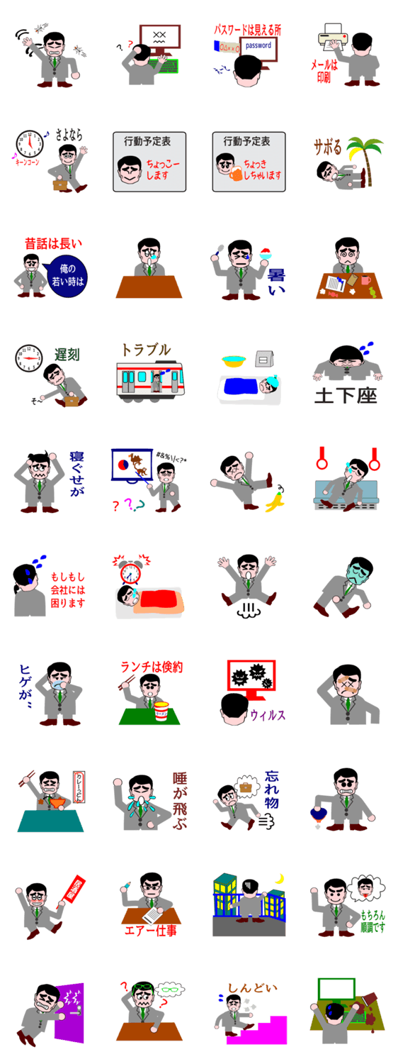 駄目なサラリーマンのスタンプです。働きは悪いけどそれなりに楽しく生きています。仕事ができるだけが会社員じゃない。いつも同じスーツを着ています。