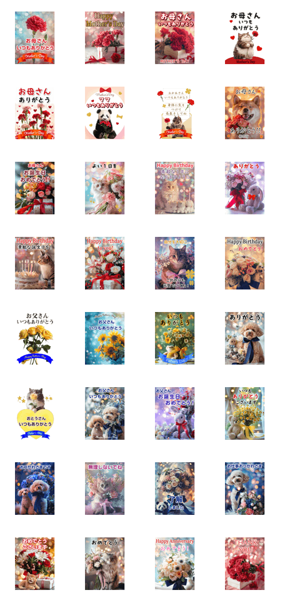 母の日&父の日にお母さん&お父さんに感謝の気持ちを伝えよう!誰にでも使えるありがとうや誕生日も数パターンあるよ♪#猫好き #犬好き #動物好き #パンダ #うさぎ ※このスタンプはトークルームで大きく表示されるBIGスタンプです。