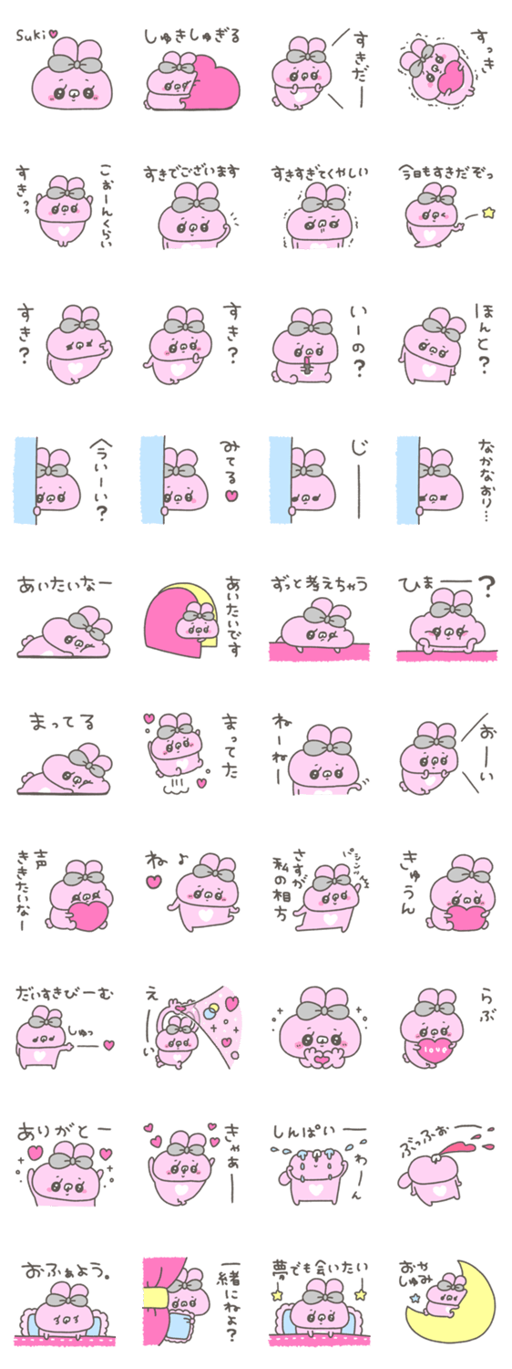 スタンプ説明 基本ごきげんなウサギの女の子。大好きを伝えたい!