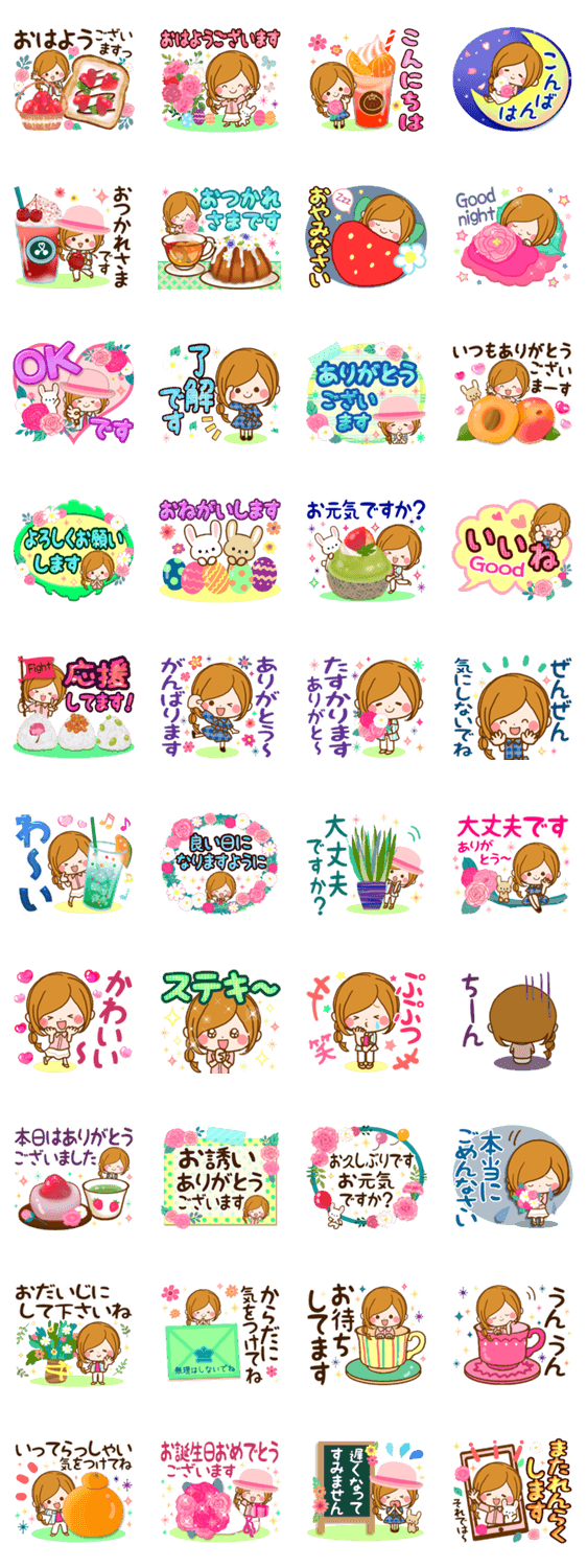 一年中使える♡便利でかわいい日常敬語スタンプです♪HAPPYカラフルな色合いと癒しの草花に、おいしい食べ物やスイーツがいっぱい♡とっても楽しくなるスタンプです☆