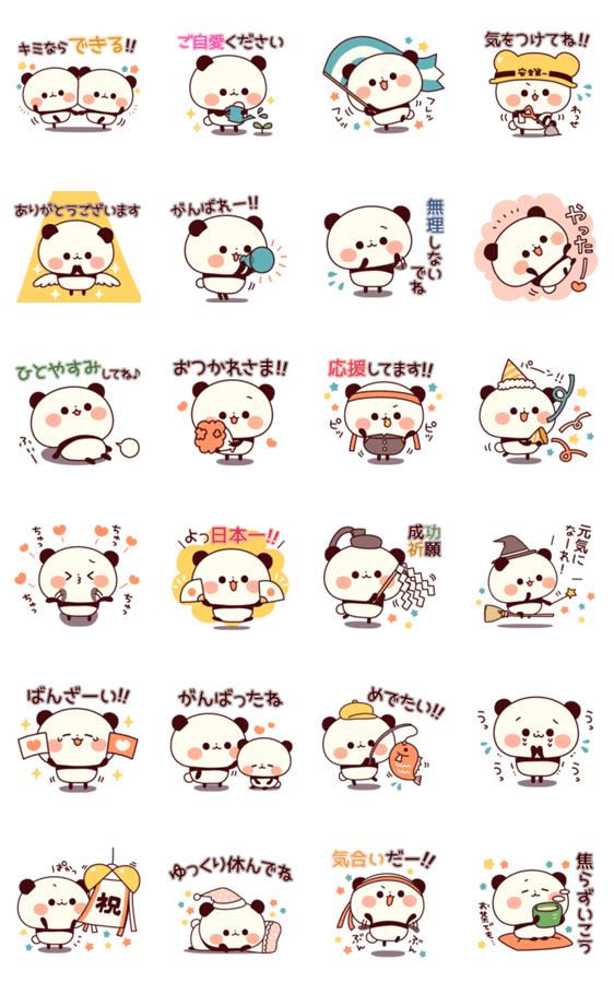 誰かを励ましたいとき、応援やお祝いをしたい時に便利♪やさしい言葉が詰まったかわいいパンダの飛びだすスタンプです。