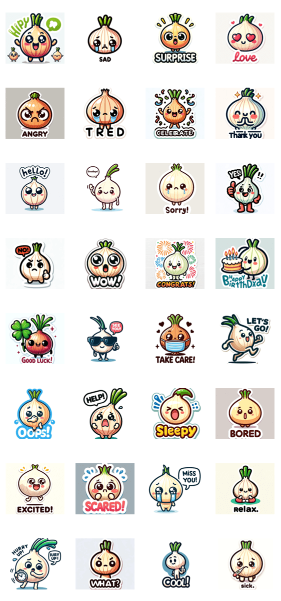 「玉ねぎの世界」スタンプセットは、愛らしい玉ねぎキャラクターが日常のさまざまな瞬間で活躍する、ユニークで楽しいスタンプです。