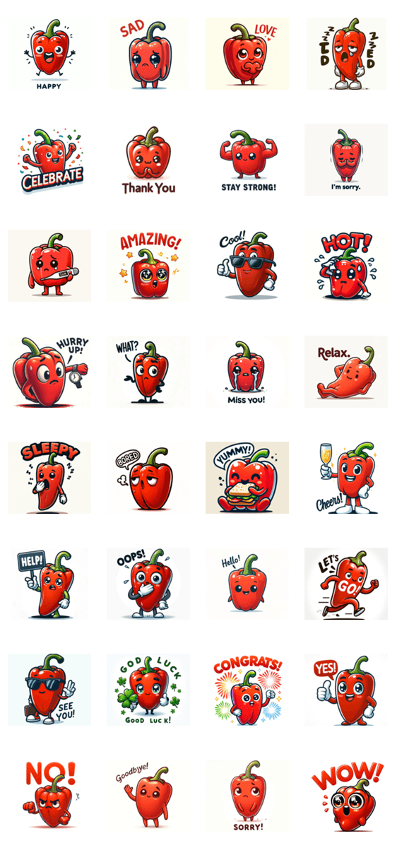 「パプリカの世界」スタンプセットは、愛らしいパプリカキャラクターが様々なシチュエーションで活躍する、楽しいスタンプです。