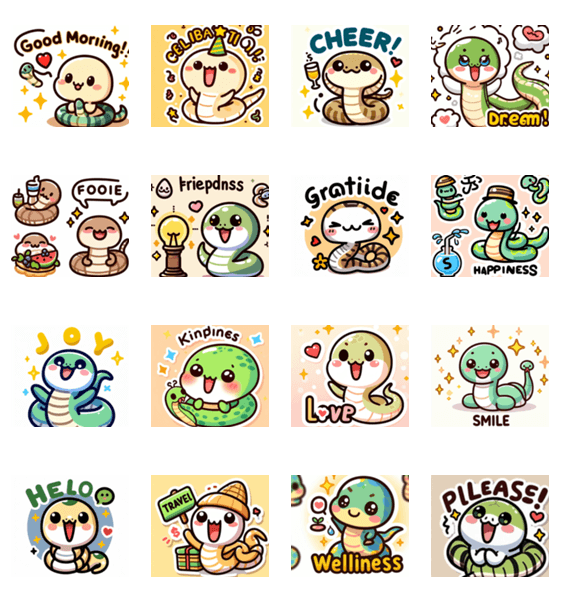 ハピネススネークのスタンプコレクションは、可愛らしい蛇たちがどんなメッセージでも喜びと活気を届けます。さまざまな色と個性が笑顔をもたらす楽しいするスタンプです!